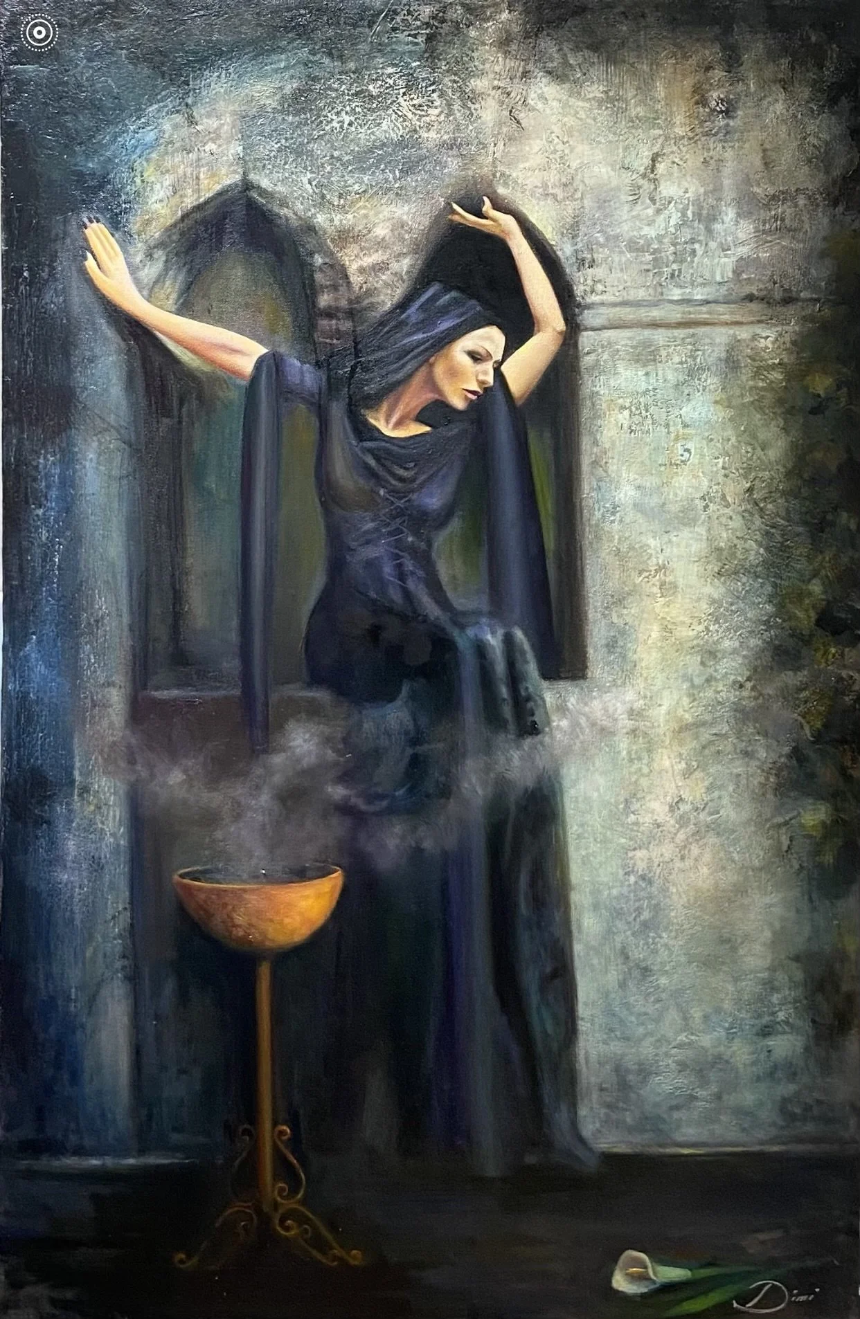 The images seen in Dimi's artwork range from angelic beauty to nightmarish beast, fervent rain forests to sand-stricken waistlands. As many viewers have discovered, Guilda Dimi has successfully been able to capture an entire imaginative journey onto a solitary canvas.